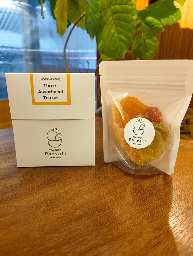 ダージリンティーと人気のドライフルーツをオトクなセットに! 【Three Assortment Tea Set】 店主オススメの、1st Flush・2nd Flush・Autumnal の3種類をセットにしました。 各クオリティシーズンのお茶の飲み比べをお楽しみください。 それぞれ10g(約5杯分)の茶葉が入っています。 (ティーバッグではなく、リーフティーです) 1パックをそのまま使った水出しダージリンもおすすめです! 作り方は下記動画をご参照ください。 【国産フルーツのみ使用・砂糖不使用のドライフルーツ】 オレンジ・キウイ・メロン・アソート(ミックス)の4種類よりお選びください。 アソートにはイチゴが入っています。 お茶請けはもちろん、スパークリングワインなどお酒にもピッタリ! *オレンジのみハチミツを使用しております。