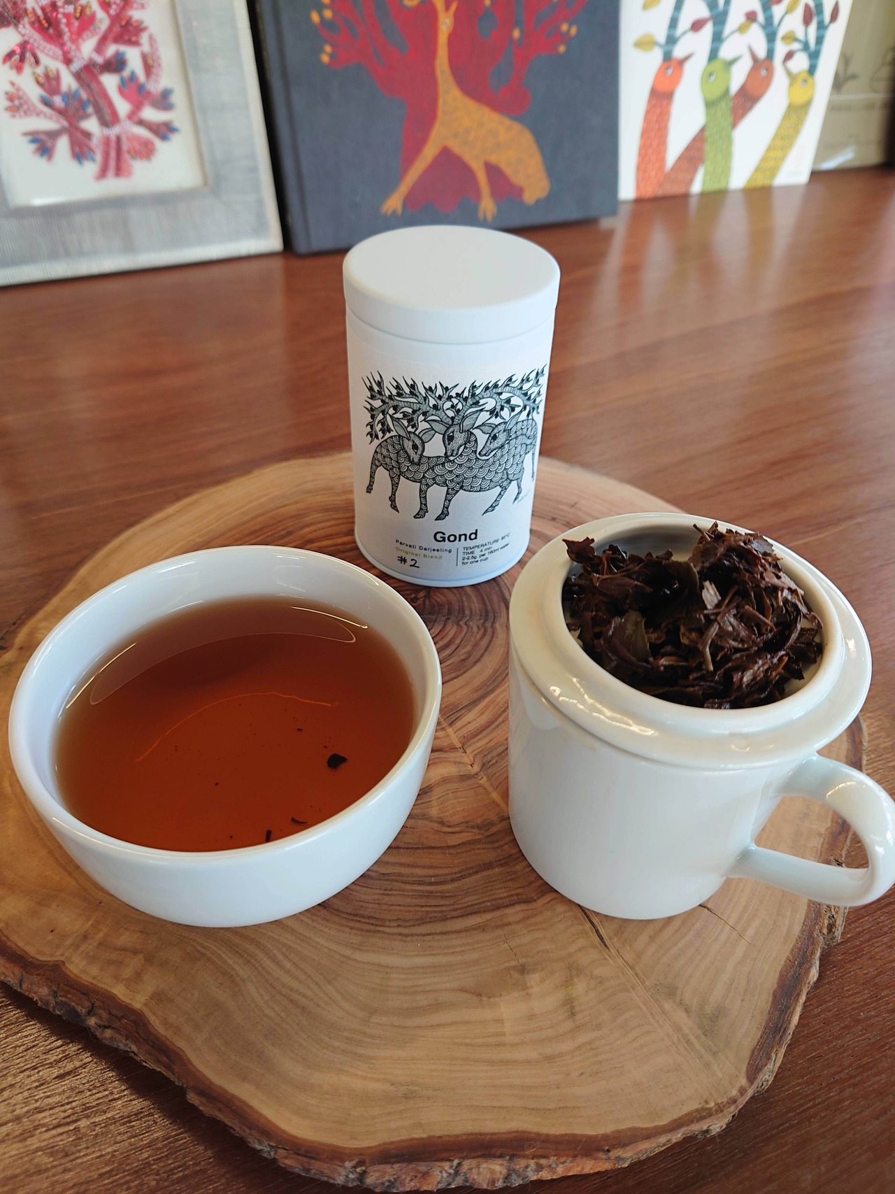 Tea Shop Parvatiでは、このゴンド・アートの原画を常設展示しており、そのゴンド・アートをイメージした100%ダージリンティーのみのブレンドティーを作りました。